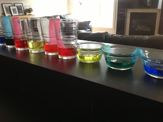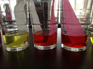 On Pinterest I saw a colour mixing experiment that I knew we had to do. I gathered the materials and we set to work. I only looked at the picture and figured it was easy enough. I did not read the instructions - MISTAKE! I saw the finished result and without thinking I put water in all three of the glasses for each colour mix, added one primary colour of food colouring to each of the outside glasses (correct) and used strips of paper towel to connect the outer glasses with the centre one - correct. We watched in anticipation as the paper towel absorbed the coloured water and crept up the paper towel where it eventually met the clear water that had travelled up from the central glass. The colour stopped travelling. I didn't see what was so obvious. After some times had passed, we ditched the paper towel strips replacing them with coffee filter strips. Same thing happened (of course), then I replaced the coffee filter strips with tissue strips and yes of course the same thing happened. I was getting kind of miffed then it dawned on me and I felt so silly. I dumped the water from the central glass of each set and replaced the tissue with fresh paper towel strips and within a very short time the experiment worked. The paper towel absorbed the coloured water and transferred it to the empty glass where upon the 2 primary colours mixed and we cheered!!
